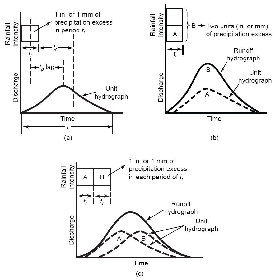 1932년 L.K. 셔먼은 강우량을 하천흐름으로 변환하는 데 일반적으로 사용되는 매우 중요한 기여를 한 단위유량도의 개념을 도입했습니다. 단위유량도는 단위시간 tr동안 내린 1단위 초과강우량으로 인해 유역의 하류에서 관측된 직접유출(기저유출 제외)의 유량도로 정의됩니다. 초과 강우량의 단위는 1인치, 또는 1cm로 정의됩니다. 강우시간의 단위는 1일 이하일 수 있지만 집중시간보다는 짧아야 합니다.