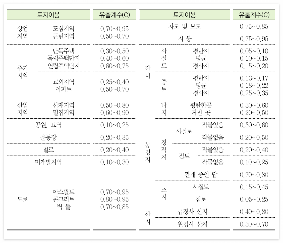토지이용 현황에 따른 합리식 유출계수 범위(Ponce, 1989)