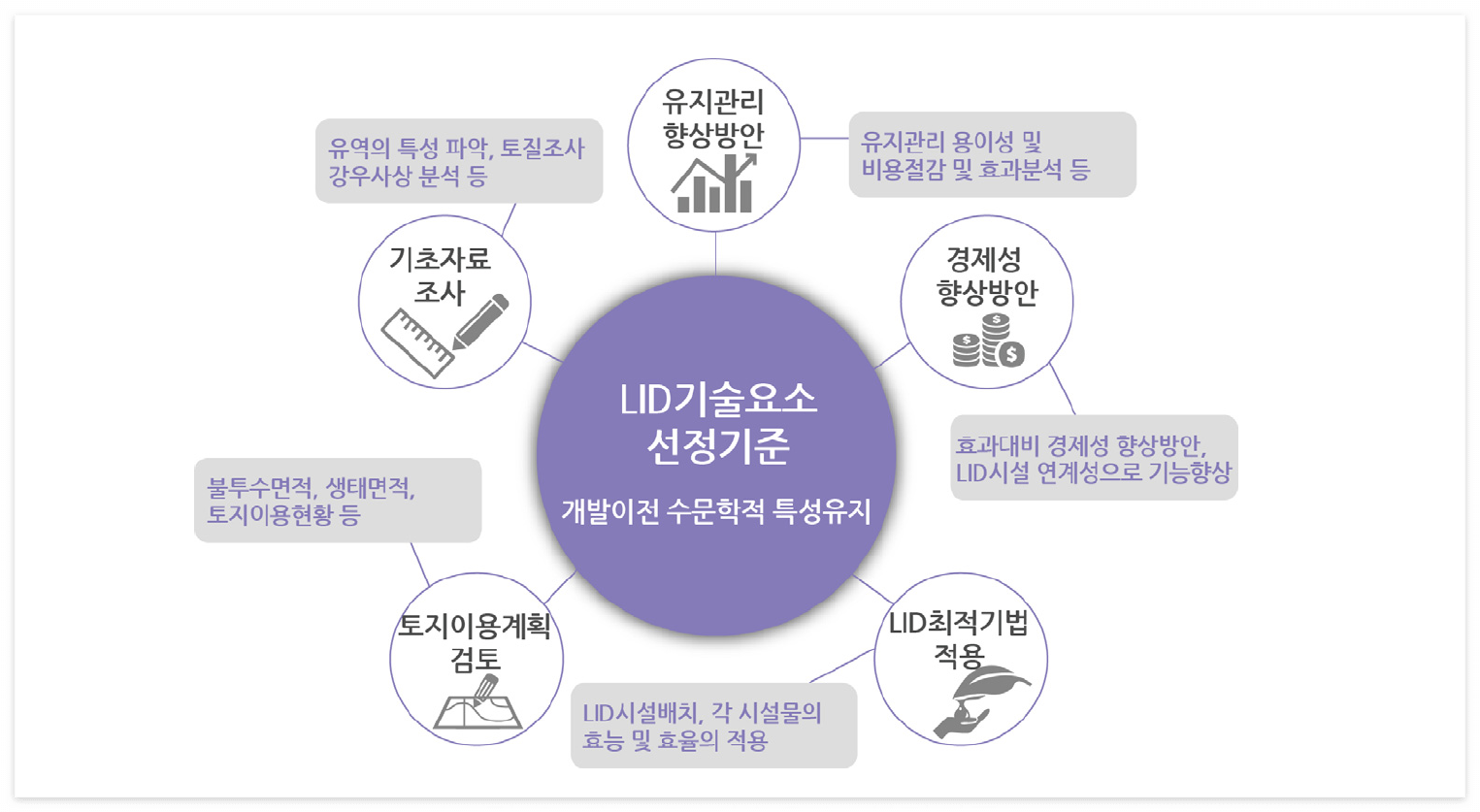- 각 LID 기술요소 간 연계성을 확보하여 효과가 극대화되도록 한다.