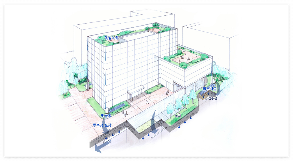 - 우선적으로 옥상녹화를 통해 빗물유출을 저감시킬 수 있도록 하며, 옥상녹화에서 유출되는 빗물은 빗물통을 설치해 저류시킨다. 빗물통을 월류하는 빗물은 침투시설, 녹지대 등을 거쳐 우수관으로 배제되도록 한다.