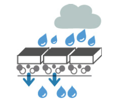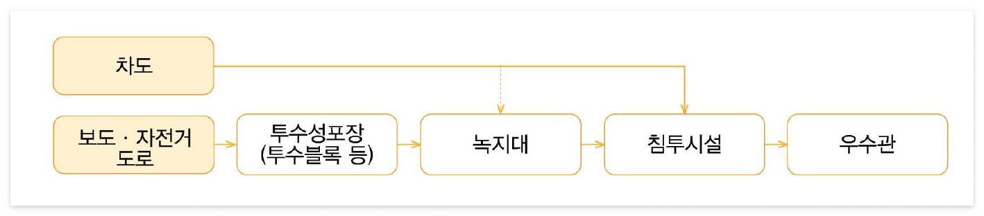 - 보도, 자전거 도로, 주차장 등 하중이 크지 않은 지표면은 투수블록 등 투수성 포장을 원칙으로 한다. 투수성 포장을 통과하여 유출되는 빗물은 침투시설, 녹지대 등을 거쳐 우수관으로 배제되도록 한다.