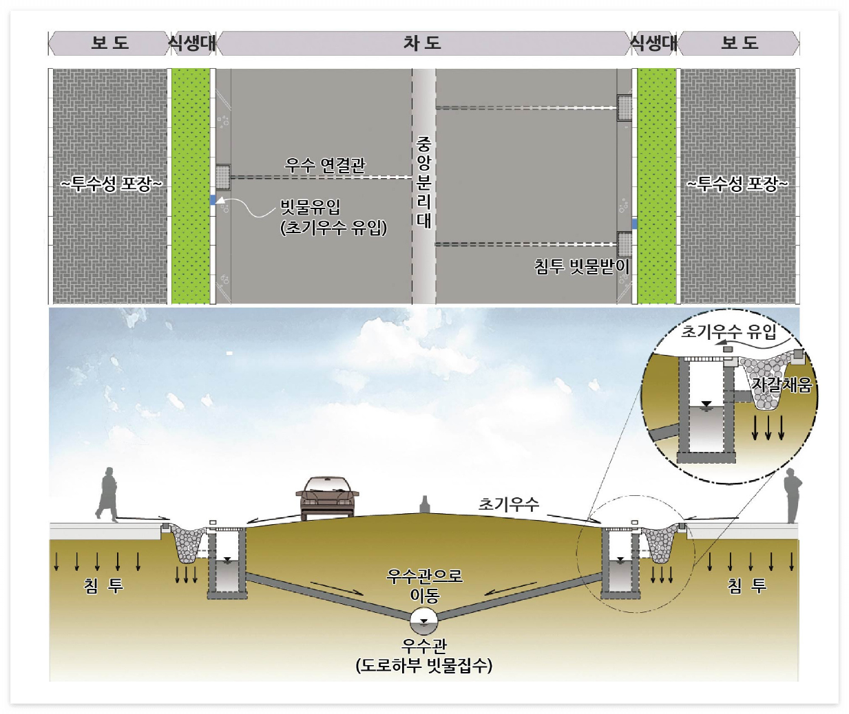 - 도로의 폭원에 따른 체계적인 접근이 중요하며 가급적 보도 식수대를 활용하되 곤란할 경우 침투빗물받이를 이용하여 처리한다.