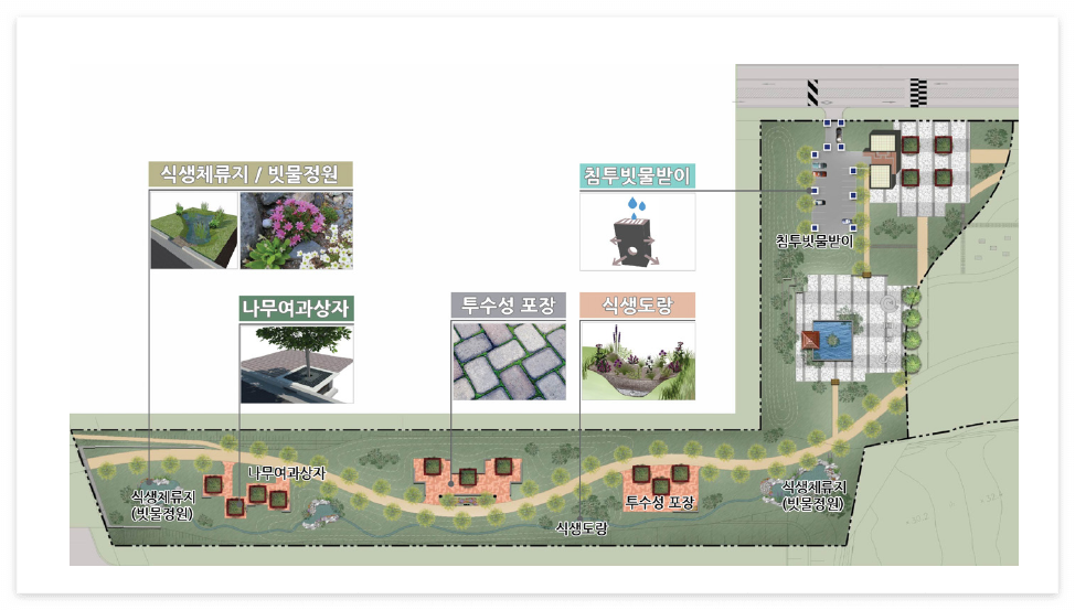 - 비점오염 저감 - 유출 저감 - 지하수 함양 - 도시열섬효과 예방 |