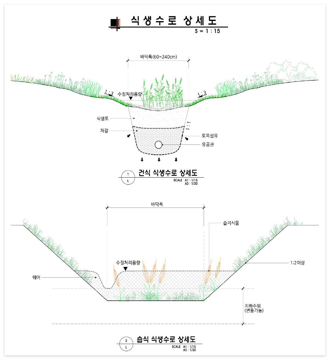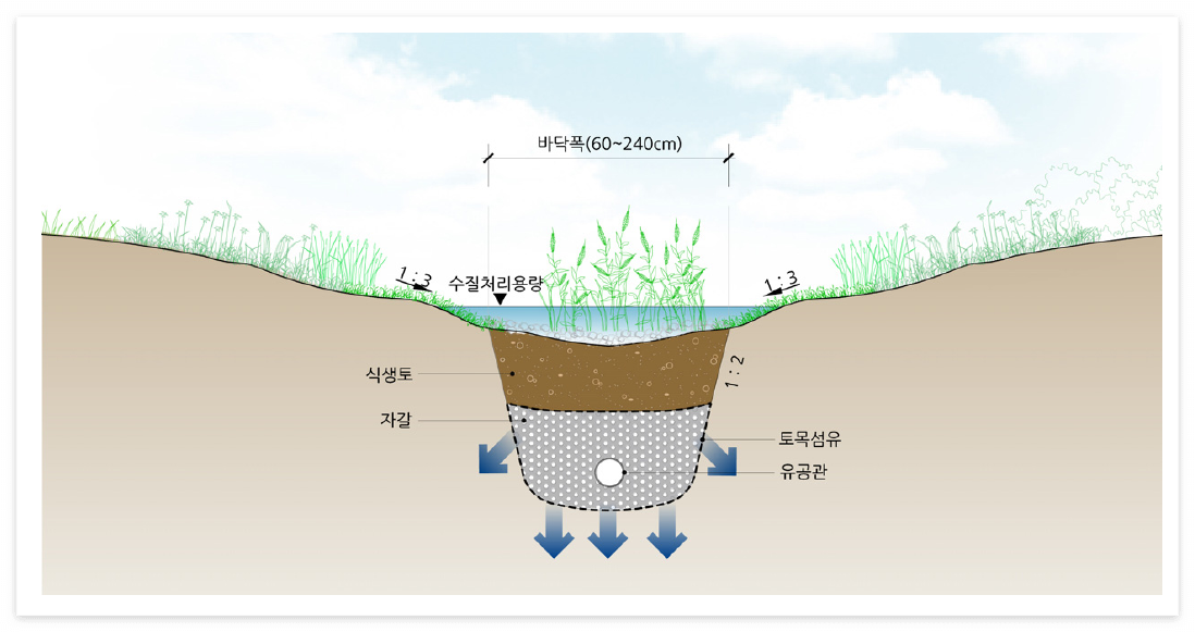 - 건식 식생수로는 바닥 빝에 30~60cm 정도의 투수성 토양설치(쇄석층 30cm, 토양층(흙+자갈) 30cm 이상 설치하고 토양층 아래 유공관을 설치할 수 있다)