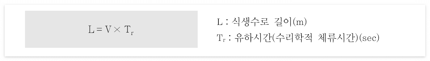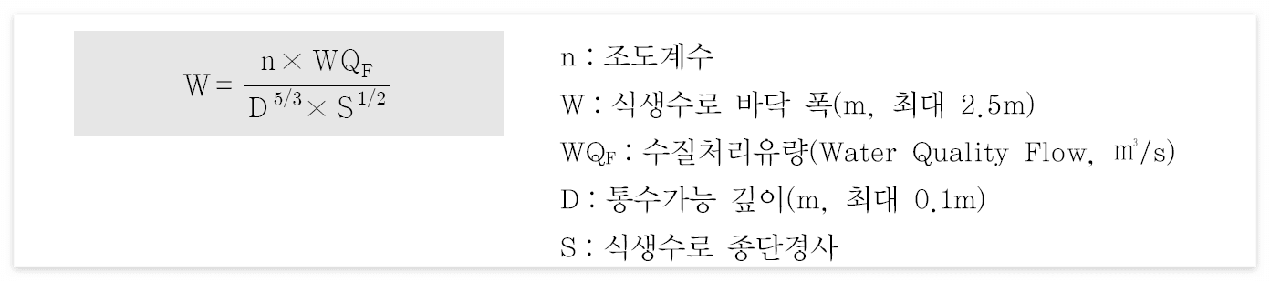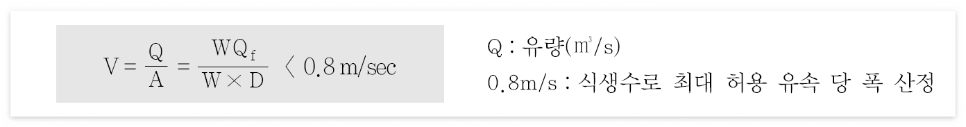 식생수로 유속은 수질처리유량(WQF)를 이용하여 결정하며 그 값이 0.8m/s 이하가 되어야 한다.
