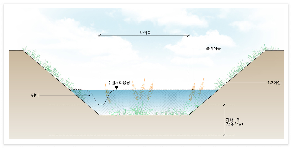 - 수심 : 수로내 잔디가 식재된 경우에는 7.5cm 이하, 그 외 식종이 식재된 경우에는 식물의 평균높이 보다 5mm 이하
