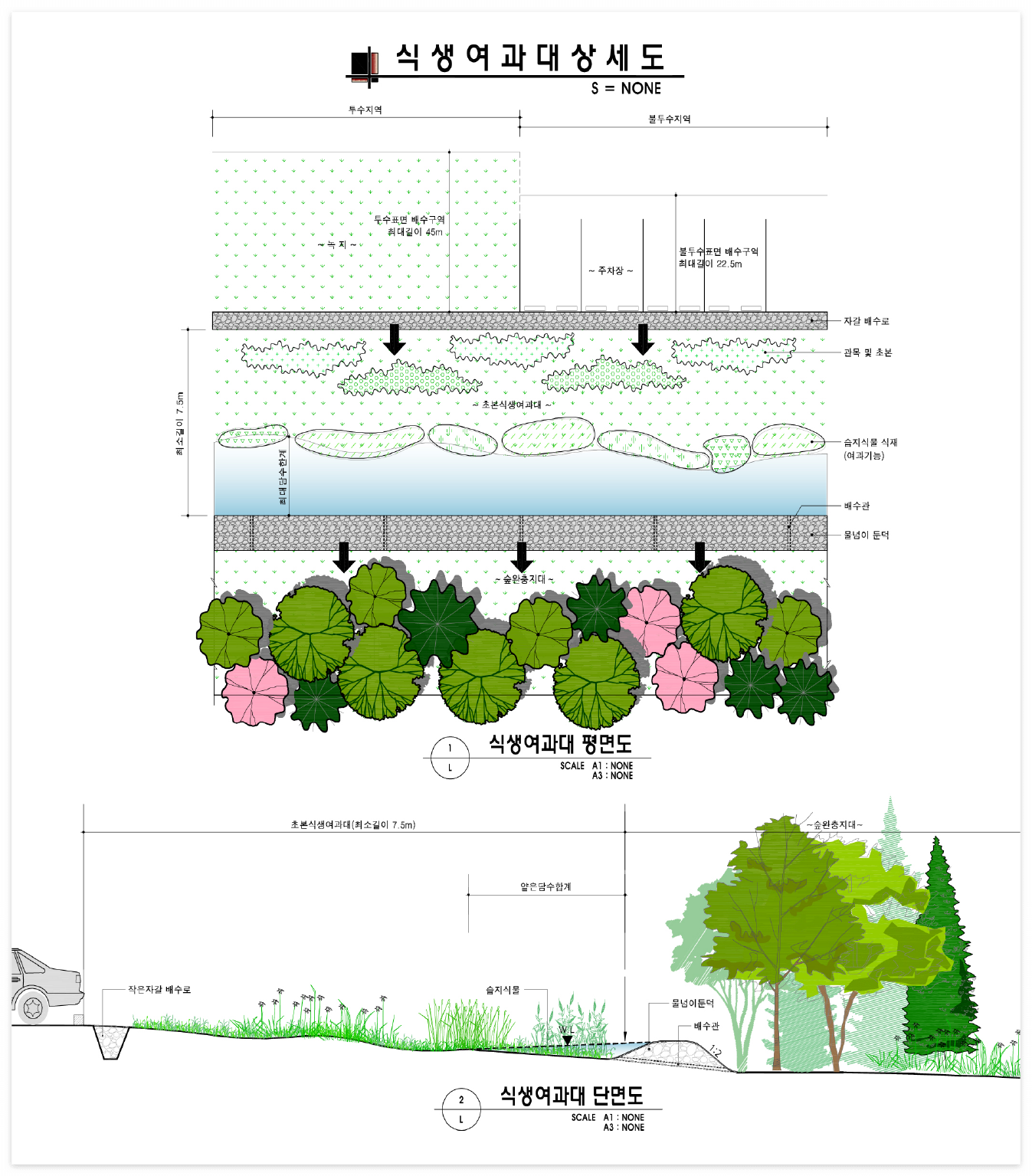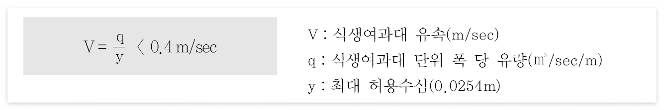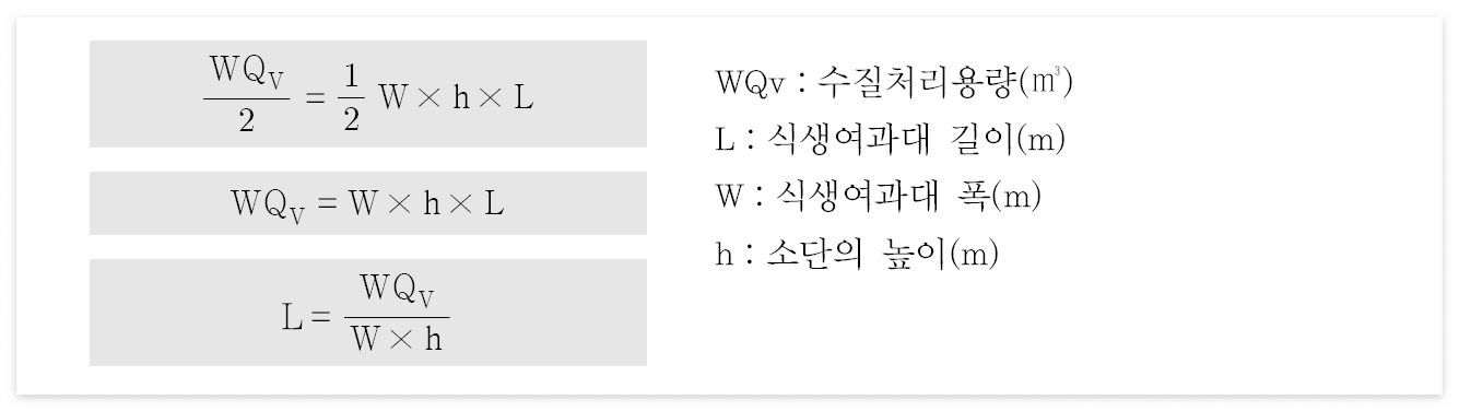 - 수심 : 식생여과대 내 최대수심 25mm(소단이 없는 경우 식생수로 길이와 동일, 소단이 있는 경우 소단의 높이를 선정한 후 수질처리용량의 50%가 소단에 의해 차집되도록 설계한다. 소단의 최대 높이는 0.3m 이하)
