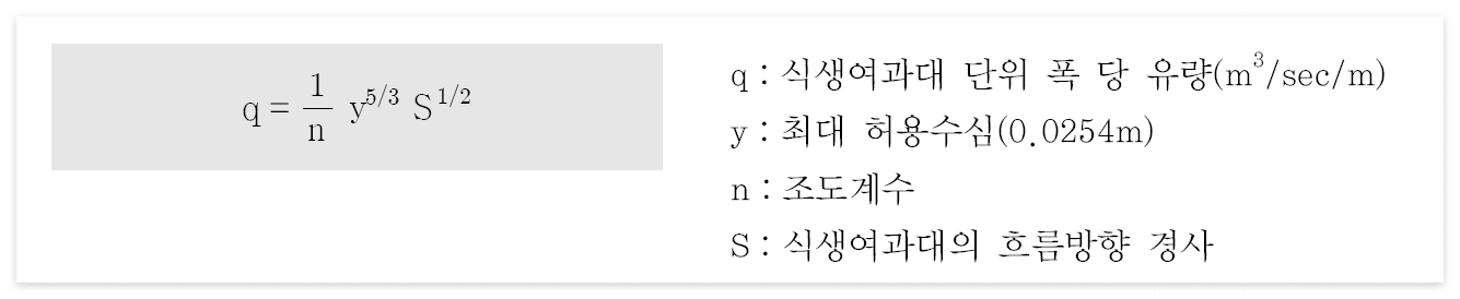- 식생 여과대 단위 폭당 유량과 최대 허용수심을 이용하여 산정