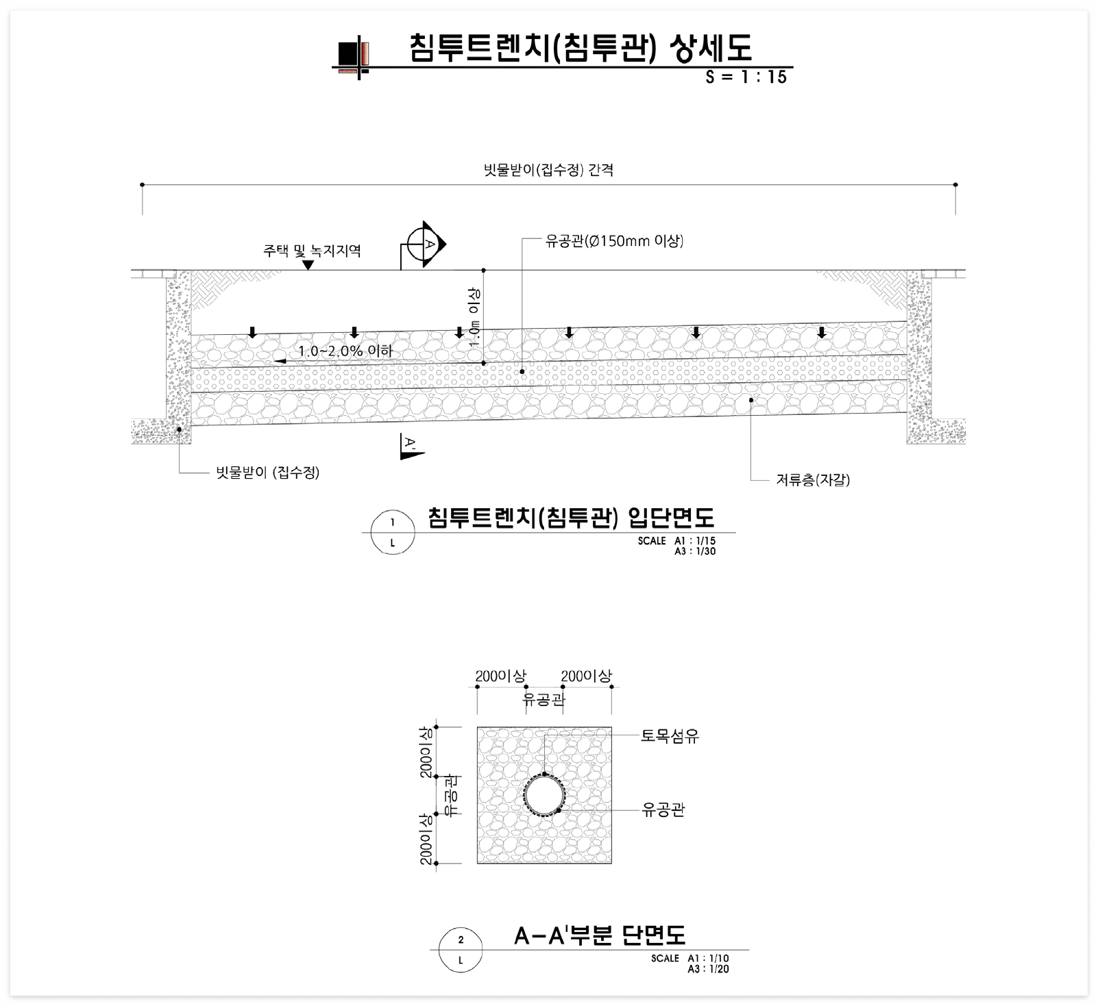 - 유공관 : 최소 150mm 이상, 개공율 0.5% 이상