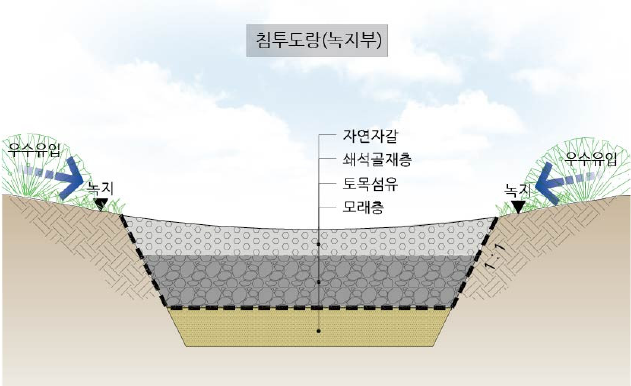 • 침투도랑은 자갈 등으로 채워진 도랑형태 처리시설로 우수유출수가 도랑을 통해 흐르는 동안 자갈 공극에 의한 흡착, 침전, 침투에 의해 오염물질을 처리하는 시설로서 강우유출수를 처리하는 기술요소이다.
