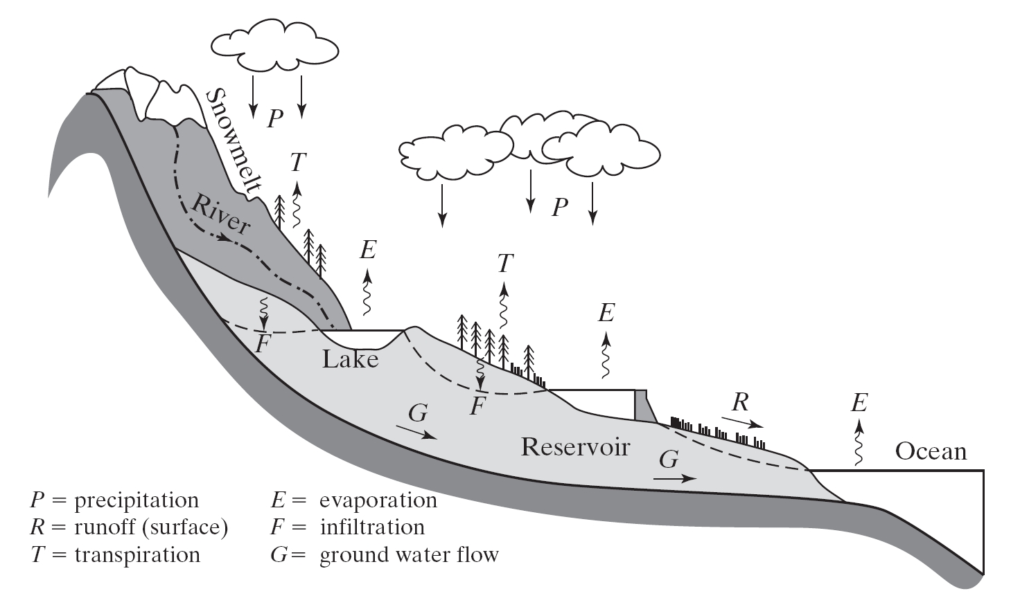 일부 물은 토양 수분 조건과 토양 유형의 함수인 침투 F로 토양 시스템에 유입되며, 나중에 중간흐름으로 수로로 재 진입하거나 침투하여 얕은 지하수를 재충전할 수 있습니다. 지하수 G는 농업 및 도시 상수도에 물을 공급하기 위해 펌핑할 수 있는 얕거나 깊은 대수층 시스템의 지하에 있는 다공성 매질로 흐릅니다. 강수량의 나머지 부분은 육상 유출 또는 직접유출 R이 되며, 일반적으로 하강 경사의 방향으로 흘러 지역 하천에 축적된 후 강으로 흘러갑니다.