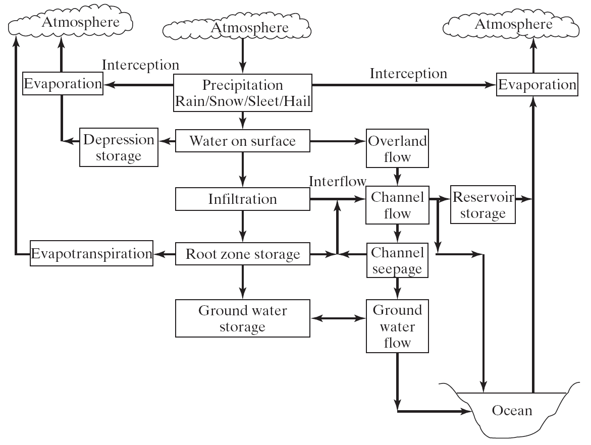 일부 물은 토양 수분 조건과 토양 유형의 함수인 침투 F로 토양 시스템에 유입되며, 나중에 중간흐름으로 수로로 재 진입하거나 침투하여 얕은 지하수를 재충전할 수 있습니다. 지하수 G는 농업 및 도시 상수도에 물을 공급하기 위해 펌핑할 수 있는 얕거나 깊은 대수층 시스템의 지하에 있는 다공성 매질로 흐릅니다. 강수량의 나머지 부분은 육상 유출 또는 직접유출 R이 되며, 일반적으로 하강 경사의 방향으로 흘러 지역 하천에 축적된 후 강으로 흘러갑니다.