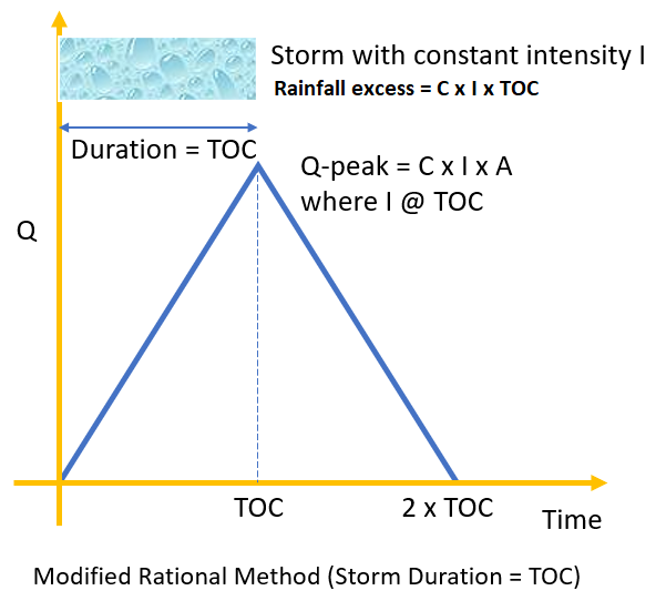합리식의 기본 가정은 유역의 모든 부분이 유출에 기여할때 꾸준하고 균일한 강우량이 최대 유출량을 생성한다는 것입니다. 이 조건은 집중시간(도달시간) tc이 경과한 후에 충족됩니다. 집중시간 tc는 유역에서 가장 먼 지점에서 유역출구 까지 홍수파가 전파되는 시간으로 정의합니다. 유출수(홍수량)은 강우강도가 tc만큼 오래 지속될 때 최대에 도달한다고 가정합니다.