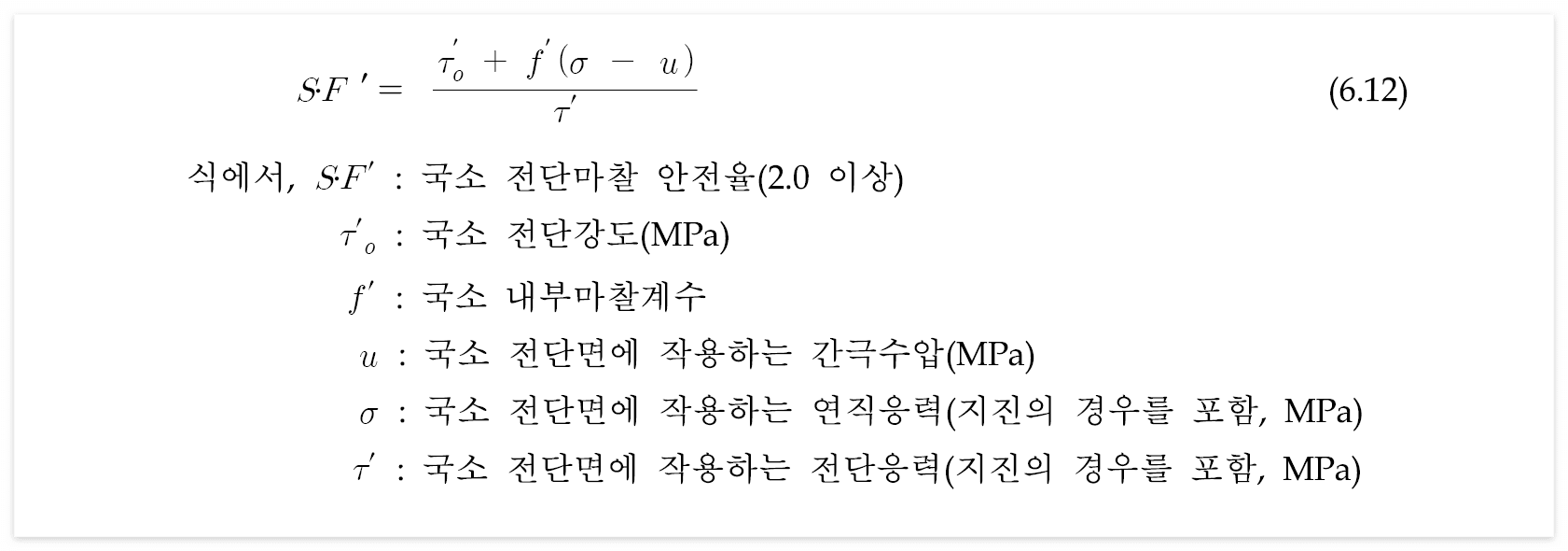 - 종력댐과 기초암반의 접촉면에서 전다마찰 안전율을 식 (6.11)로 구하고, 국소전단파괴에 대한 안전율은 식 (6.12)로 계산하며 전단면의 위치, 방향, 암반의 성상 등을 고려하여 검토한다.