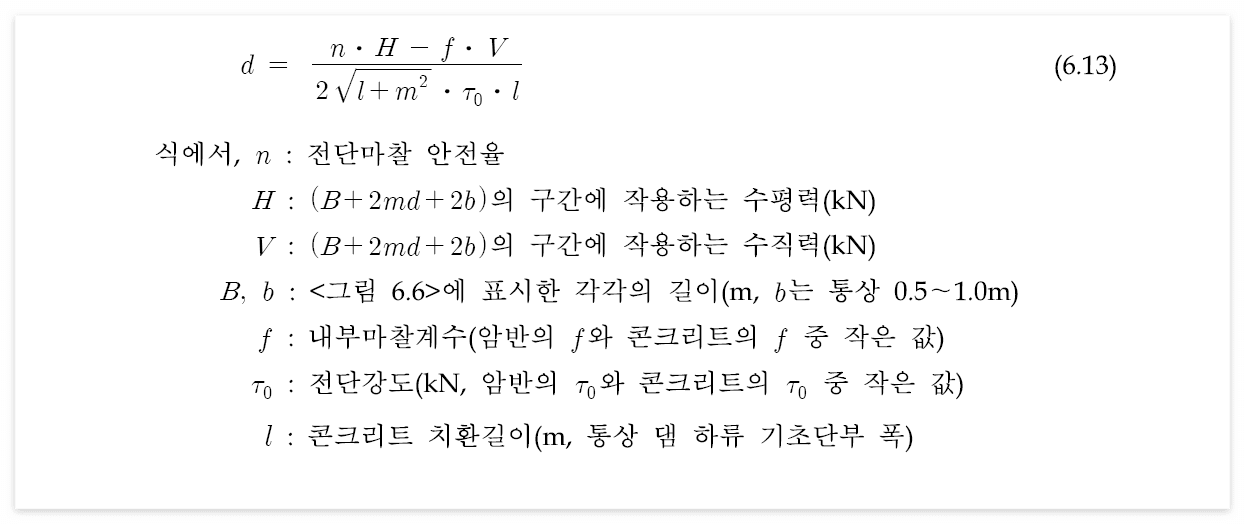 - 콘크리트 중력댐에서 하류단 부근의 단층 치환처리 심도는 다음 식 (6.13)으로 계산한다.