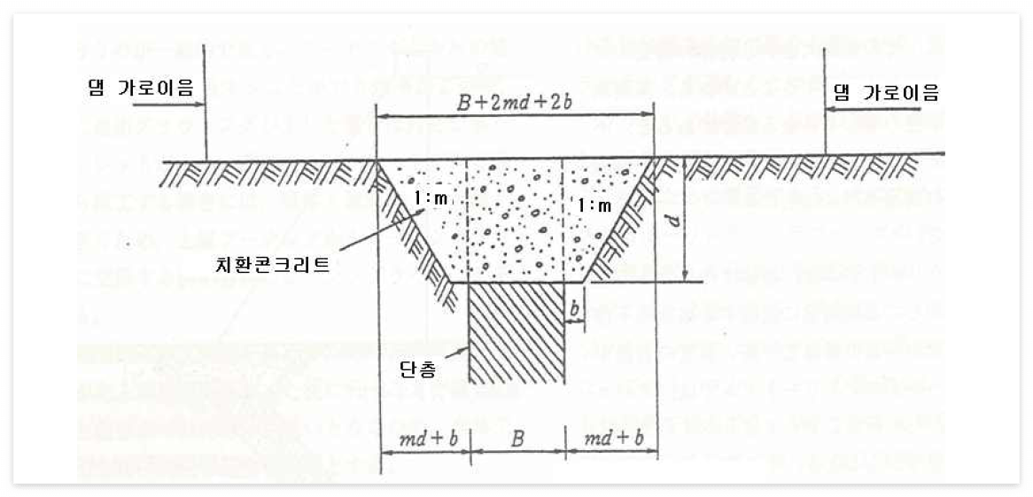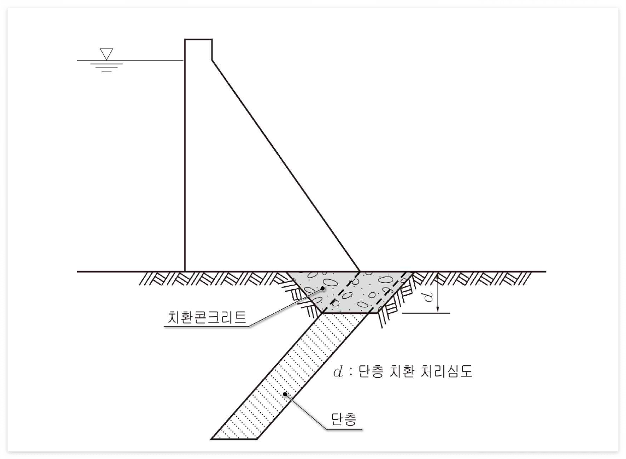 - 단층처리는 아래와 같이 보통 콘크리트 치환공법으로 하며, 치환의 규모와 심도는 약층의 위치, 방향, 규모, 강도, 변형성 등 댐과 기초의 안정성을 검토하여 결정한다.