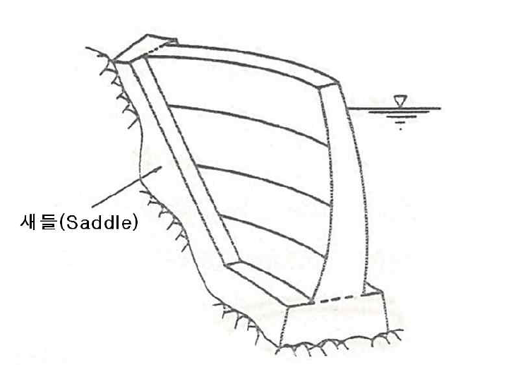 - 새들은 기초암반에 작용하는 응력을 완화하기 위해 아치댐 본체와 기초암반 사이에 설치한다.