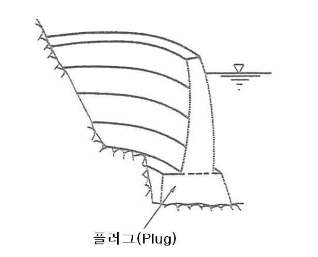 - 플러그는 지형에 깊은 틈이 있는 장소 또는 단층, 그 밖의 연약층을 제거한 자리를 채우는 콘크리트 부분으로 댐체의 기본형상과 구별해서 그 크기와 형상을 정할 수 있다.