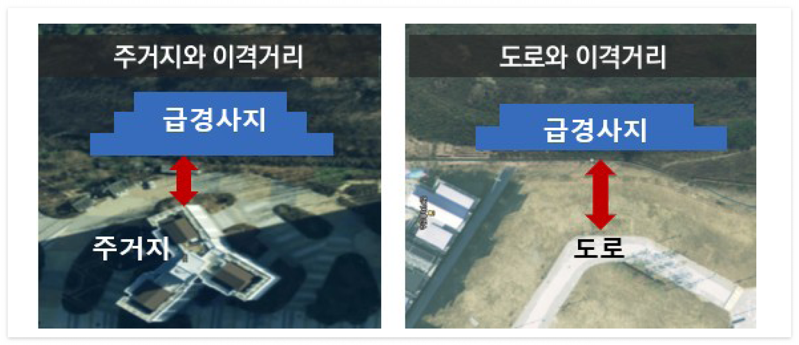 - 이러한 정량적인 지표를 제시하기 위하여 이격거리 개념이 필요한데, 이격거리는 비탈면 하단(비탈끝)과 주거지 또는 도로 등의 시설물과의 최단거리를 의미하며, 이 이격거리가 피해 범위보다 넓은 경우 피해 가능성이 낮을 것으로 예상할 수 있다.