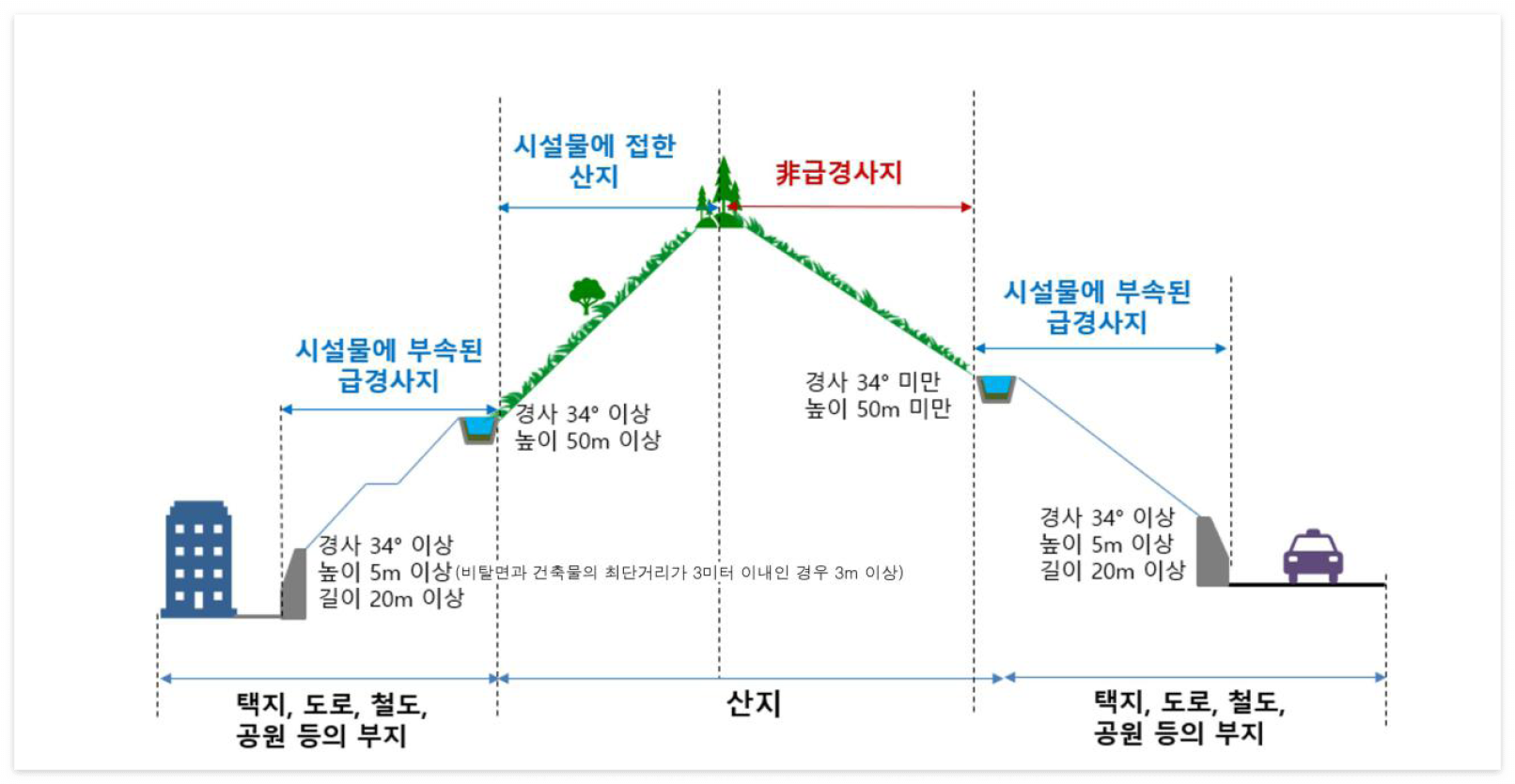 - 법적 정의해서 급경사지는 택지, 도로, 철도 및 공원시설 등에 부속된 비탈면을 명시하고 있다.
