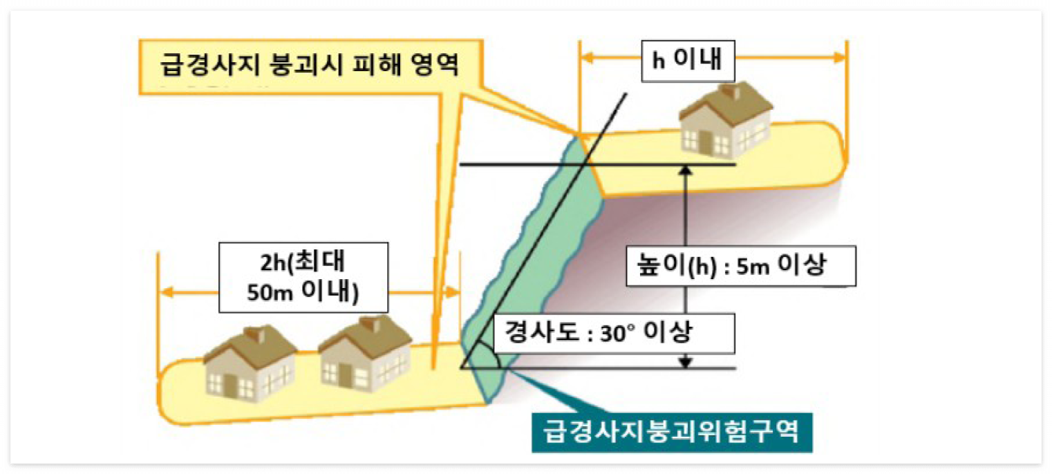 - 급경사지의 경우 경사도 30˚ 및 높이 5m 이상의 급경사지가 인가와 공공시설에 피해를 줄 우려가 있는 피해영역을 비탈면 높이의 2배 이내로 하되, 50m를 상한으로 설정하고 있다.