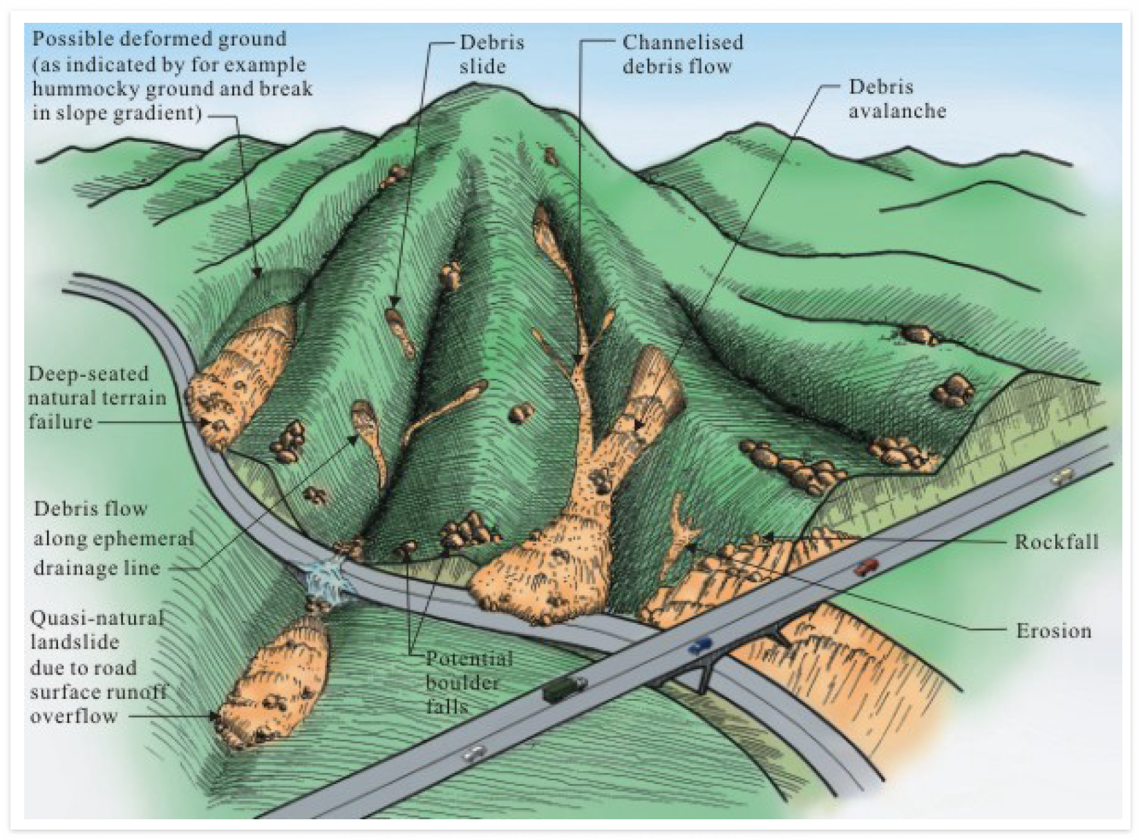 - 오랜 기간 동안의 변화를 거치면서 안정화되어 왔던 자연비탈면은 지형, 지진활동, 지하수위 흐름, 강도감소, 응력 변화 및 풍화 등의 변화로 인하여 급격하게 붕괴가 발생될 수 있으며, 이러한 자연비탈면의 붕괴는 이들 영향이 매우 복잡하고 다양하게 얽혀 파괴에 이르는 것으로 추정 및 연구되고 있다.