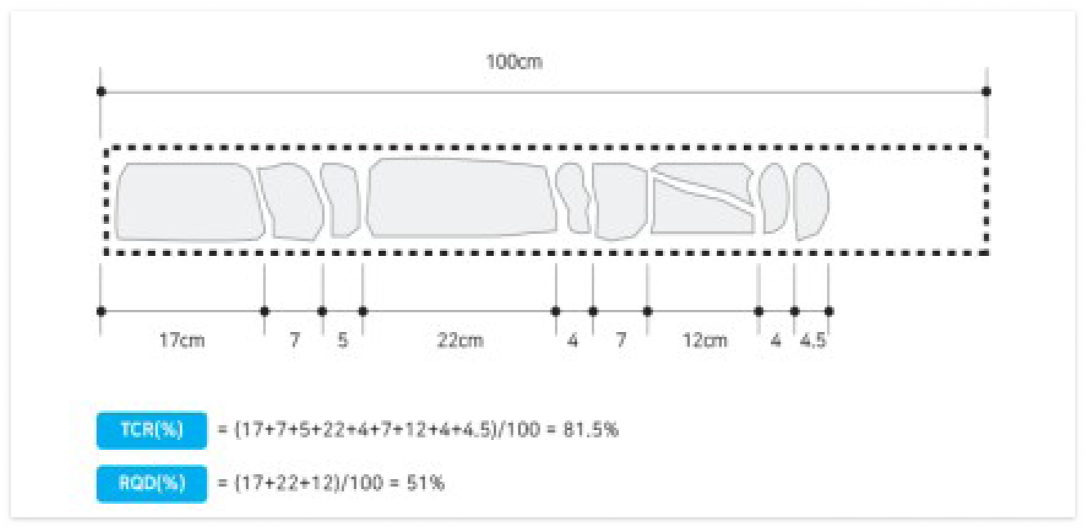 - 정의 : 현장에서 지반의 물성 및 역학적 특성을 파악하기 위해서 코어 채취기를 이용하여 암석시료를 채취할 때 파쇄되지 않은 상태로 회수되는 정도를 의미하며 암반의 구성에 따라 시추안 암석의 길이에 대한 회수된 코어 길이를 백분율로 나타낸것