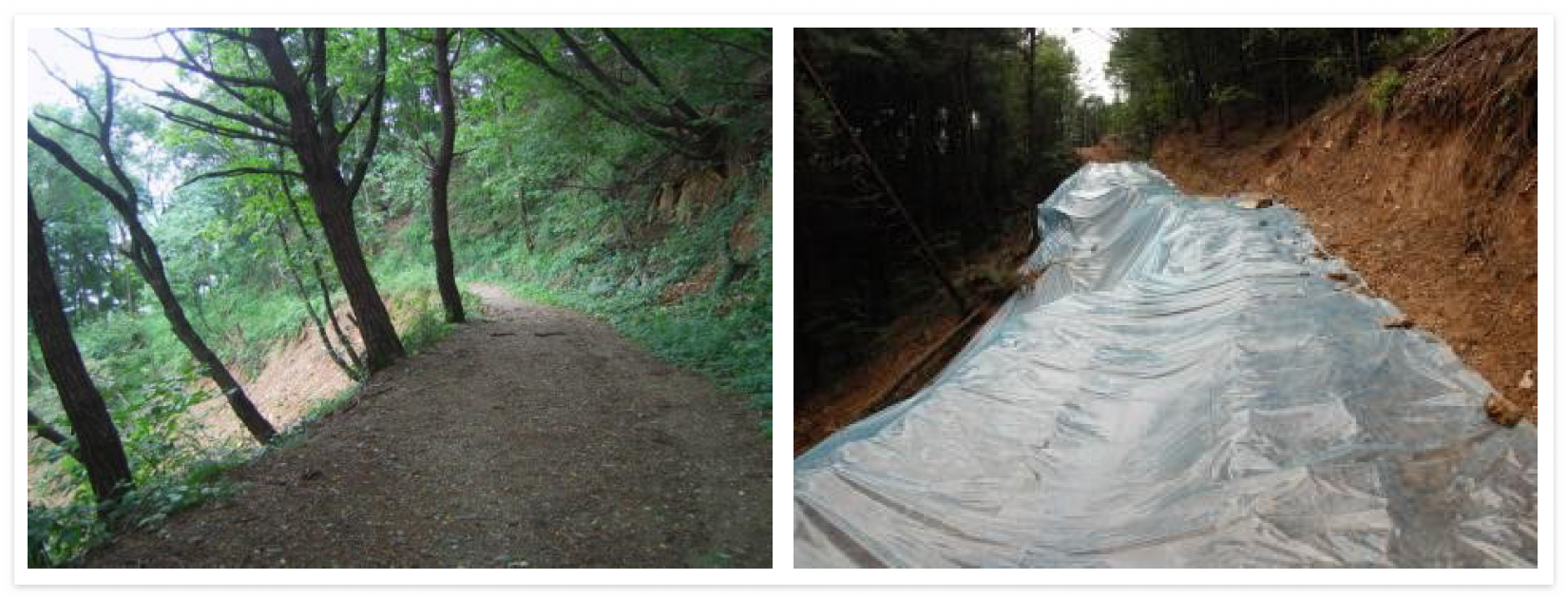 - 급경사지를 형성하는 산지 내 조성되어 있는 임도, 군사도로, 공사도로 등은 임시적인 이동통로 확보를 목적으로 조성된 구조물이기 때문에 산지를 깎아 형성함에 있어 안정성 확보를 위한 배수시설, 도로 하부 유실 방지 공법 등이 적용되지 않은 상태가 대부분으로 도로 조성 후 방치된 상태로 특별한 관리가 진행되지 않을 경우에는 산사태 발생의 시작점으로 작용될 가능성이 높다.