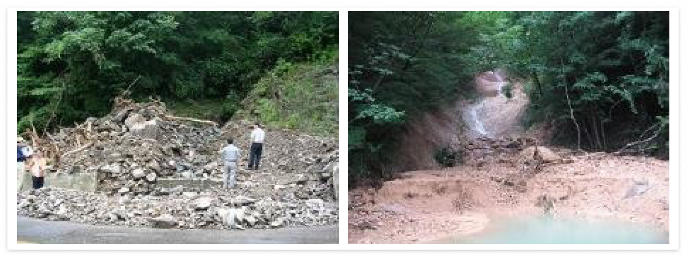 - 계곡내 퇴적전 자연 토사댐의 붕괴로 인한 쇄설물의 이동