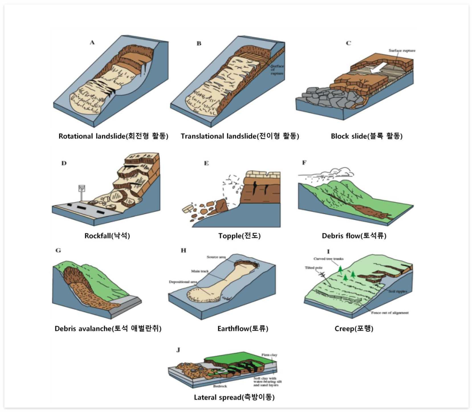 - 산사태는 전술한 바와 같이 여러 학자들에 의해 정의되고 분류되고 있는데, 아래 그림은 주요 산사태 형태에 대해서 그 특징을 일반인들도 쉽게 알 수 있도록 미국지질조사소(USGS)에서 제작한 모식도이다.(Highland and Johnson, 2004).