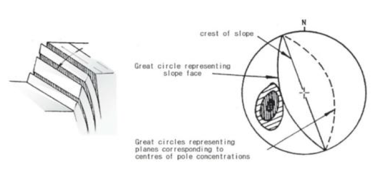 - 두 불면속면의 교선과 비탈면의 경사방향이 같고 각 절리면의 주향이 비탈면 주향과 유사