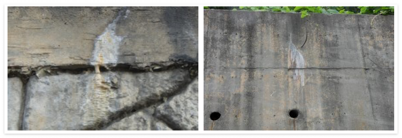 • 옹벽 배수공 불량은 우기 시 배면부의 토압 증가를 야기시켜 옹벽의 안전성에 크게 영향을 주는 경우가 있으며, 옹벽 배수공 불량 유형은 뒤채움 흙의 유출이 없는 아주 양호한 상태, 뒤채움 흙의 유출이 부분적으로 일어나 배수의 원활한 흐름에 영향을 주는 보통의 상태, 뒤채움 흙의 유출로 인해 배수공이 완전히 막혀 옹벽 배면부의 과도한 수압증가를 초래하여 옹벽의 안전성에 큰 영향을 조는 불량한 상태로 구분할 수 있다.