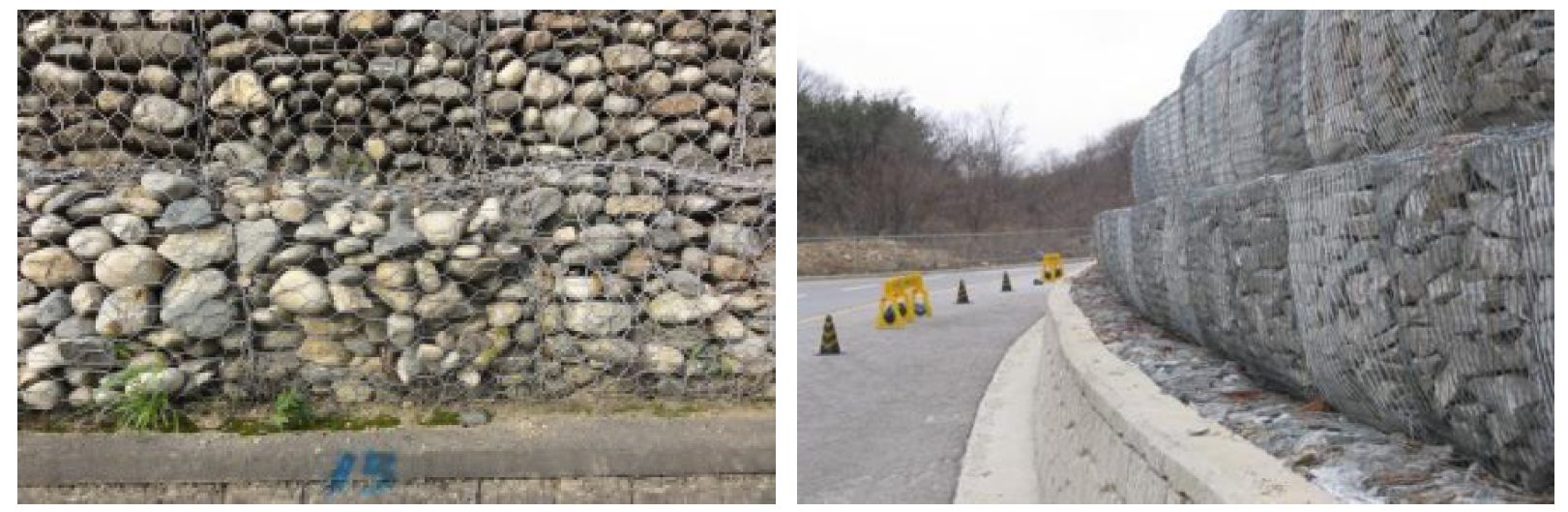 • 채움재의 유실은 부실시공 및 와이어 메쉬의 파손으로부터 발생될 수 있으며, 채움재의 유실로 인해 옹벽 자중 감소와 공극발생으로 인한 배면지반의 침하 및  활동저항력 감소로 인한 변형의 원인이 될 수 있다.