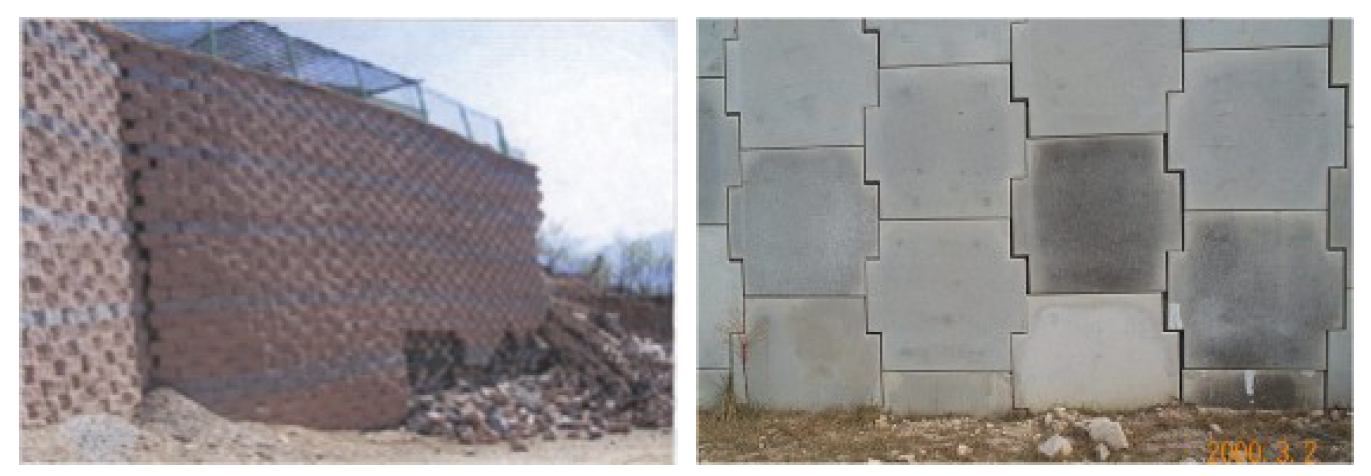 • 전면판의 유실은 보강토 옹벽 전면판 일부가 유실된 현상으로 육안으로 확인할 수 있고, 전면판의 이격은 전면판이 안쪽으로 밀려들어갔거나 주위블록에 비해 내려앉은 현상으로 인해 블록간의 간격이 벌어진 현상으로 이러한 현상은 국부적인 집중하중이나 배면지반 또는 기초부의 부등침하에 의해서 일어날 수 있다.