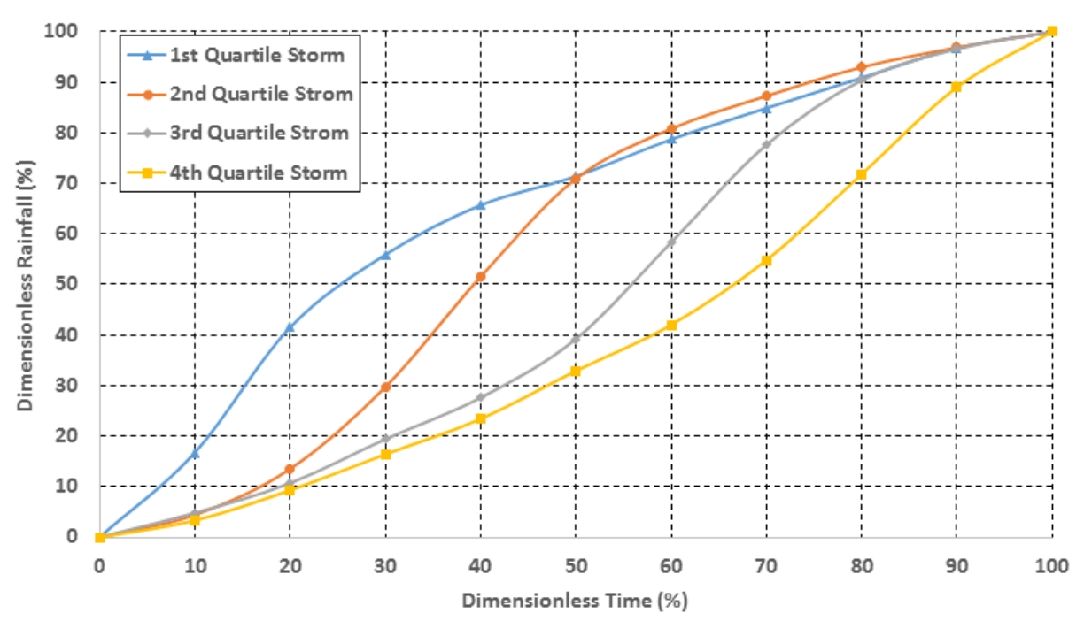 설계강우의 시간분포는 Huff 방법을 사용하는 것을 원칙으로 하며, Huff 방법의 무차원 누가곡선은 「지역적 설계 강우의 시간적 분포」(국토부, 2000)의 자료를 기준으로 한다. 무차원 누가곡선은 회귀분석을 통해 회귀식으로 표시하여야 한다. Huff 방법의 분위는 첨두홍수량이 최대가 되는 분위의 사용을 우선적으로 검토하여야 한다.
