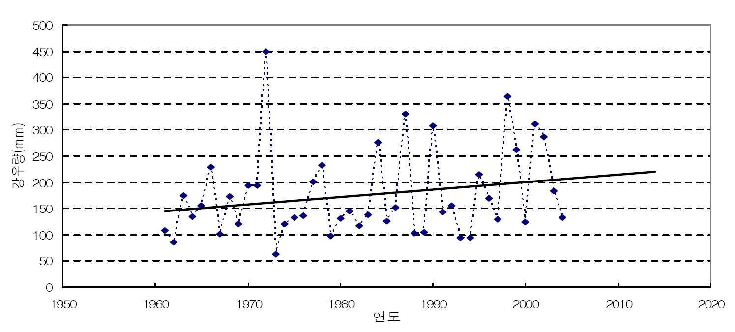 시우량 관측자료에 대하여 연도별 최대강우량의 경향성을 분석한다. 경향성 분석에는 회귀분석, 이동평균 등 최대강우량 증가추이를 최적 모형화가 가능한 분석기법을 사용할 수 있도록 한다.