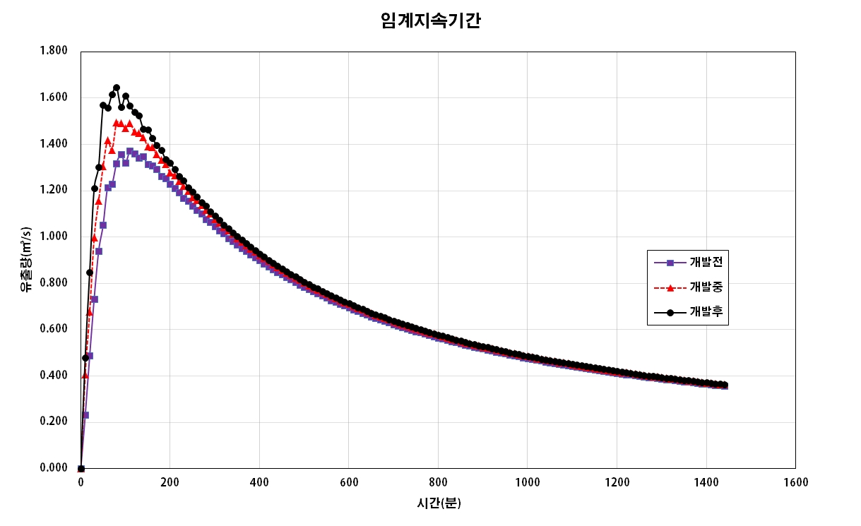 현재 및 목표연도의 임계지속시간을 기준으로 유출총량 증가량(유출총량의 차)을 설정하여 이를 기준으로 우수유출저감시설을 설치하는 근거로 활용한다.