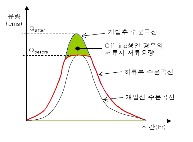 | 특성 | 관거, 또는 하도내 저류시설 설치 모든 빈도에 대해 유출저감 가능 첨두홍수량 감소 및 첨두 발생 시간 지체 Off Line에 비해 상대적으로 큰 설치규모 |