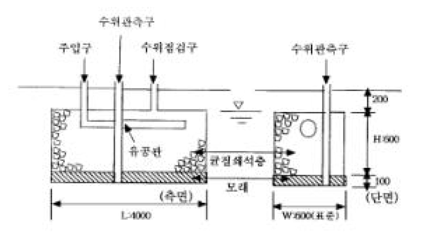 | 시험 시설의 개요 | 1. 직경 20cm 강도의 오거구멍을 이용한다. 2. 침투면은 수면 아래의 전면(측면과 저면) |