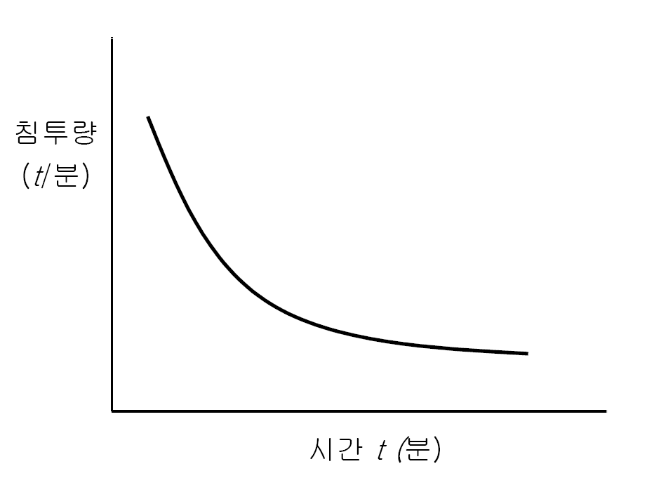 • 종기침투량 : 침투시험결과는 단위시간 당 침투량과 주입시간의 관계도를 이용하여 정리한다. 물을 계속하여 주입하면 단위시간 당 침투량은 거의 일정치를 나타내므로 이 양을 종기침투량으로 정의한다. 더욱이, 2시간 물을 주입해도 침투량이 거의 일정하게 되지 않을 경우는 물의 주입을 중단하고 그 때의 침투량을 종기침투량으로 정하는 것이 좋다.