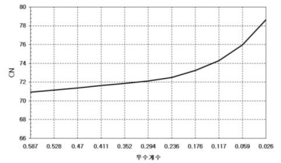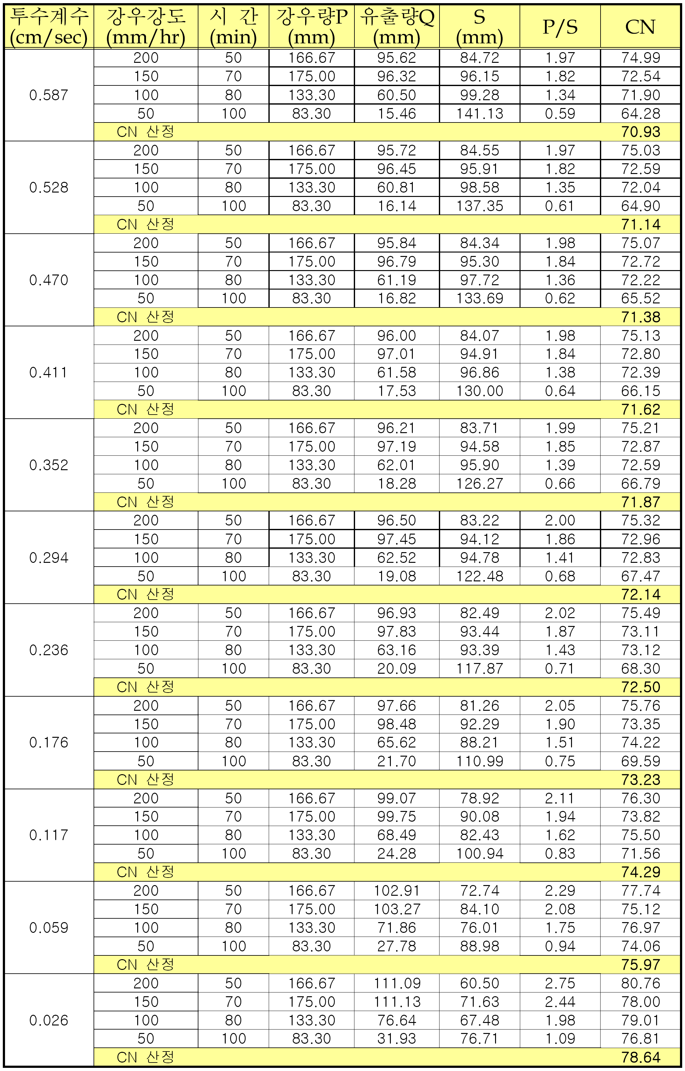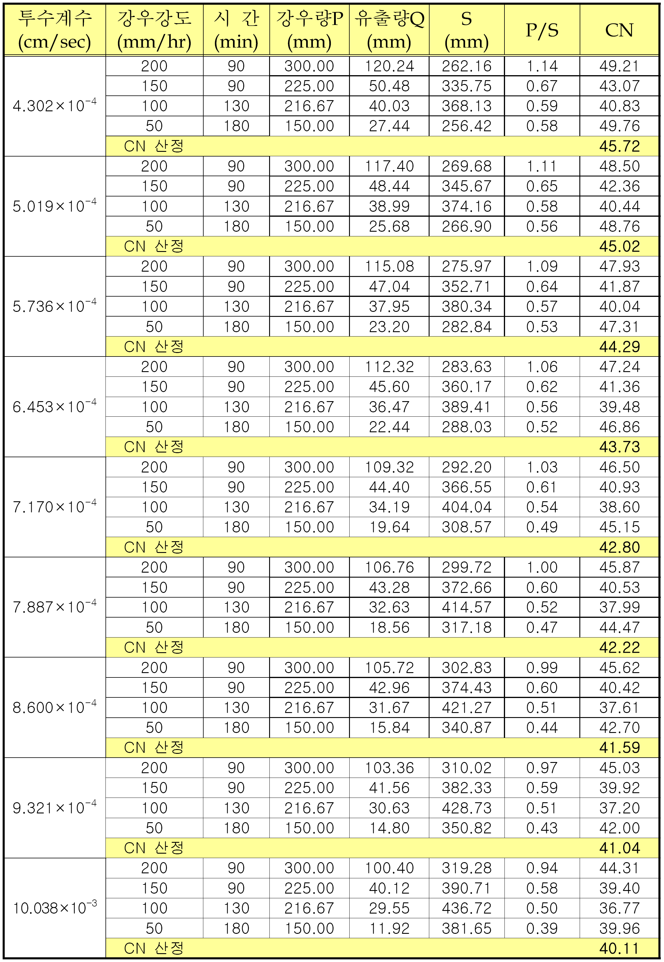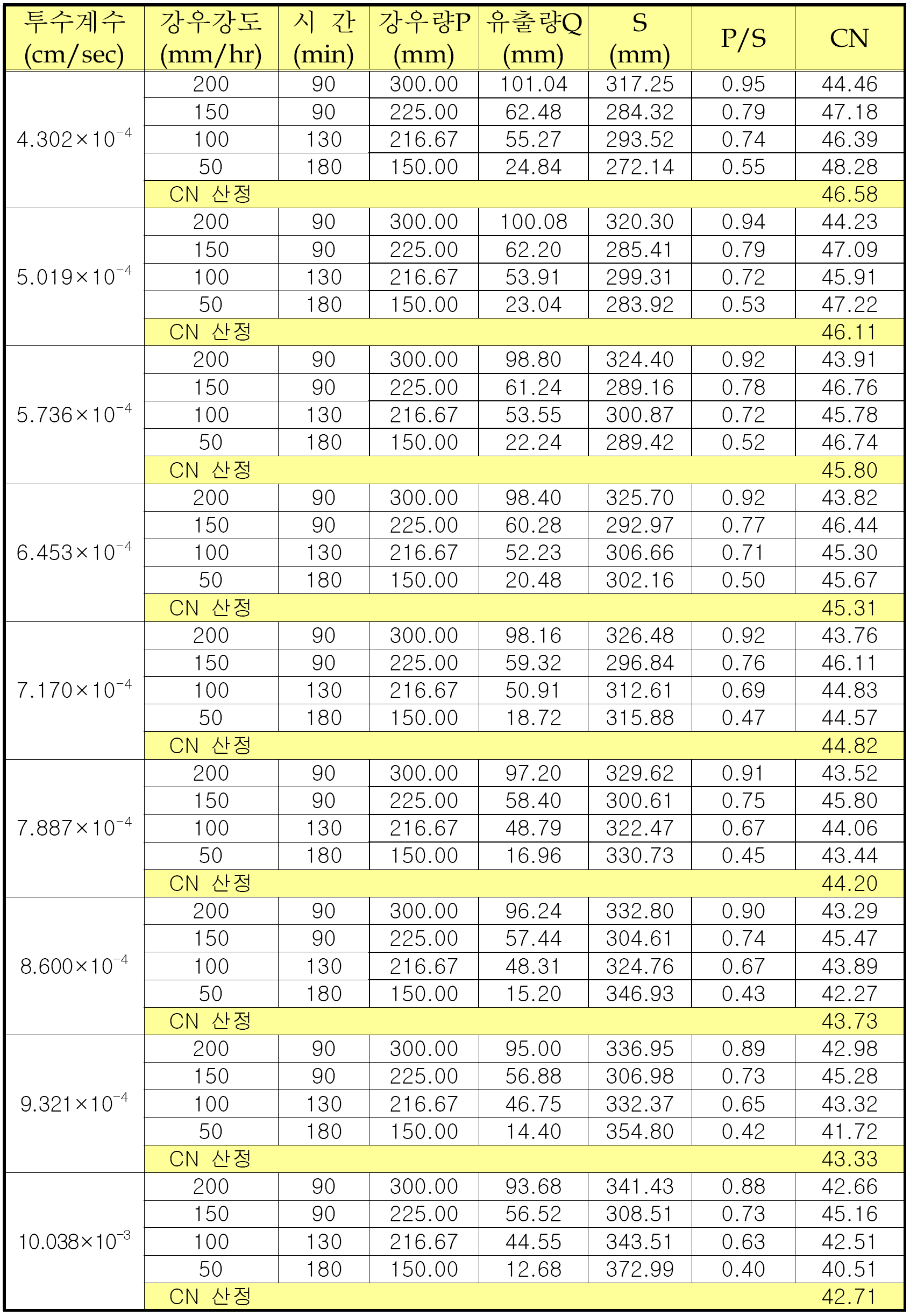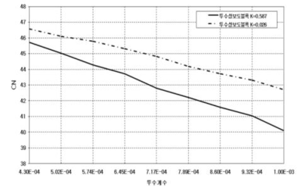 | 투수성 보도블록 투수계수별 CN | 하부토양 투수계수별 CN |