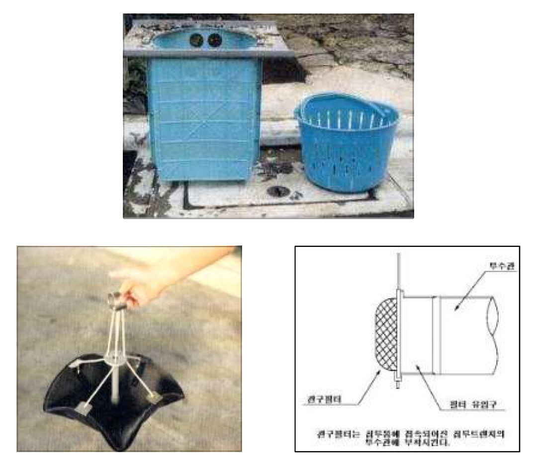② 막힘 방지장치에는 상부필터, 저부필터, 관입구에 설치하는 필터 등이 있으며, 설치목적에 따라 적절하게 선택할 필요가 있다. 또한, 막힘 방지장치는 착탈이 쉬운 재료를 이용하며, 일정 수준 이상의 강도를 가지는 것으로 한다.
