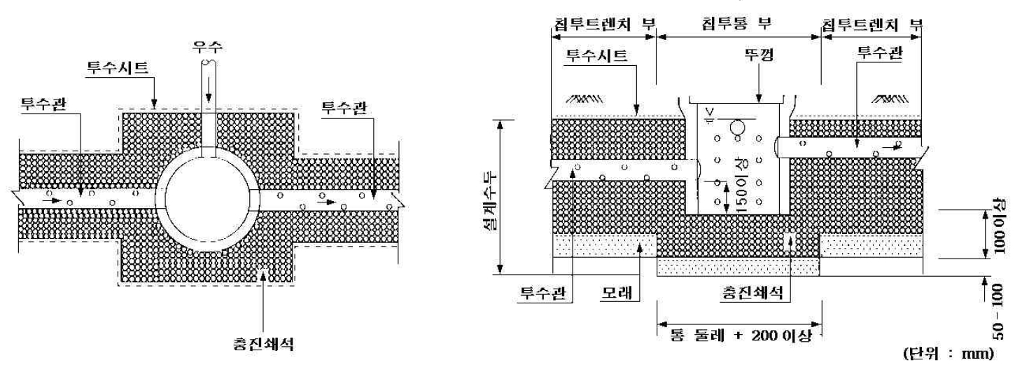 침투통은 크게 통 분체와 침투층으로 구분할 수 있다. 통 분체는 「하수도 시설기준(맨홀)」에 따라 위치선정 및 설치규모를 결정하며, 침투층은 통 본체의 크기에 따라 모래와 쇄석층으로 구분한다.