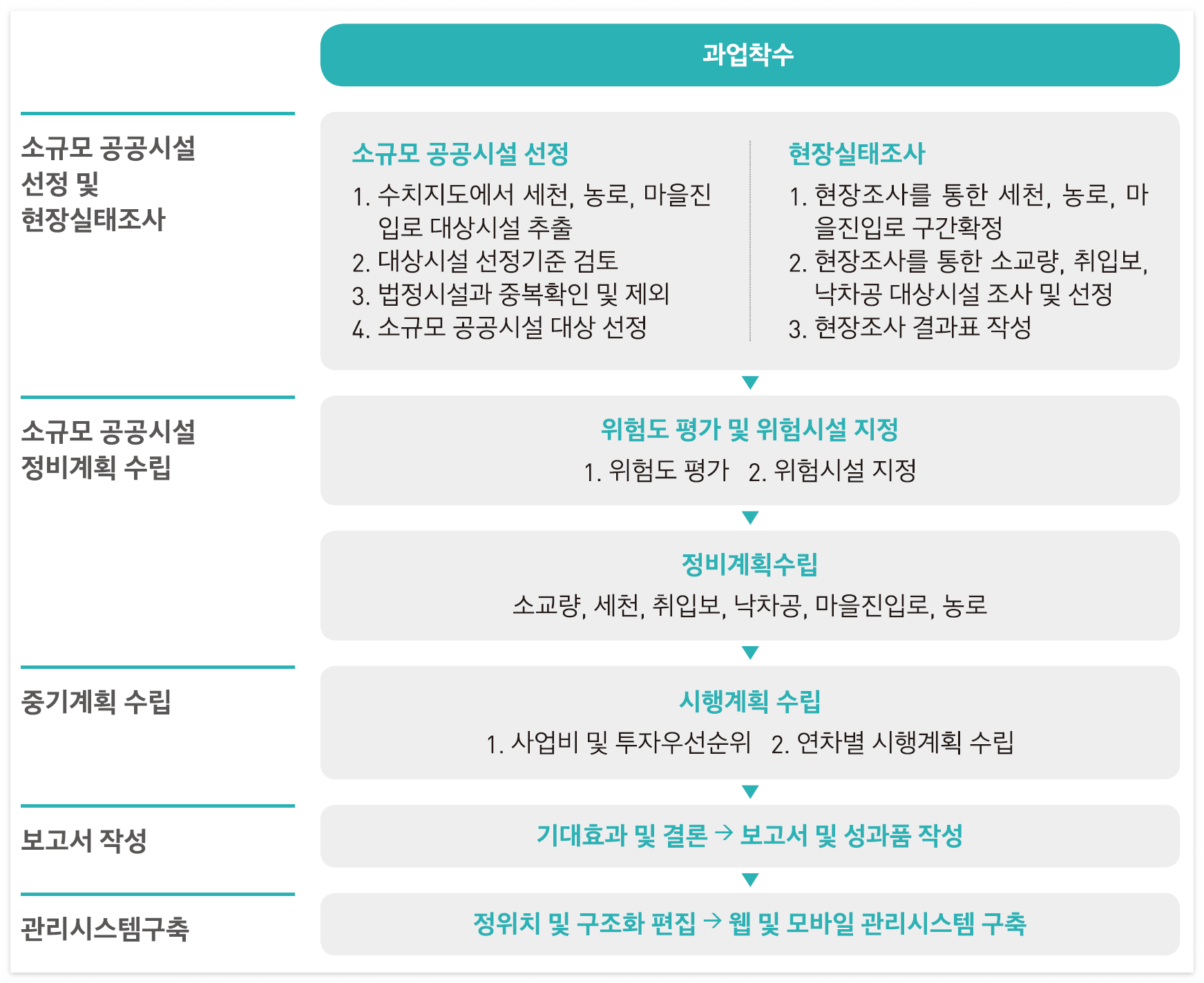• 관내 분포된 소규모 공공시설에 대한 관리 및 위험시설 정비계획 수립을 위한 기초자료를 구축하는 것으로 현장실태조사를 통한 시설물을 조사하여 소규모 공공시설 대장에 부합하는 속성자료, 현장사진을 작성하고 기존 구조물 도면 취득이 가능할 경우 구조물 도면을 포함하여 데이터베이스를 구축한다.
