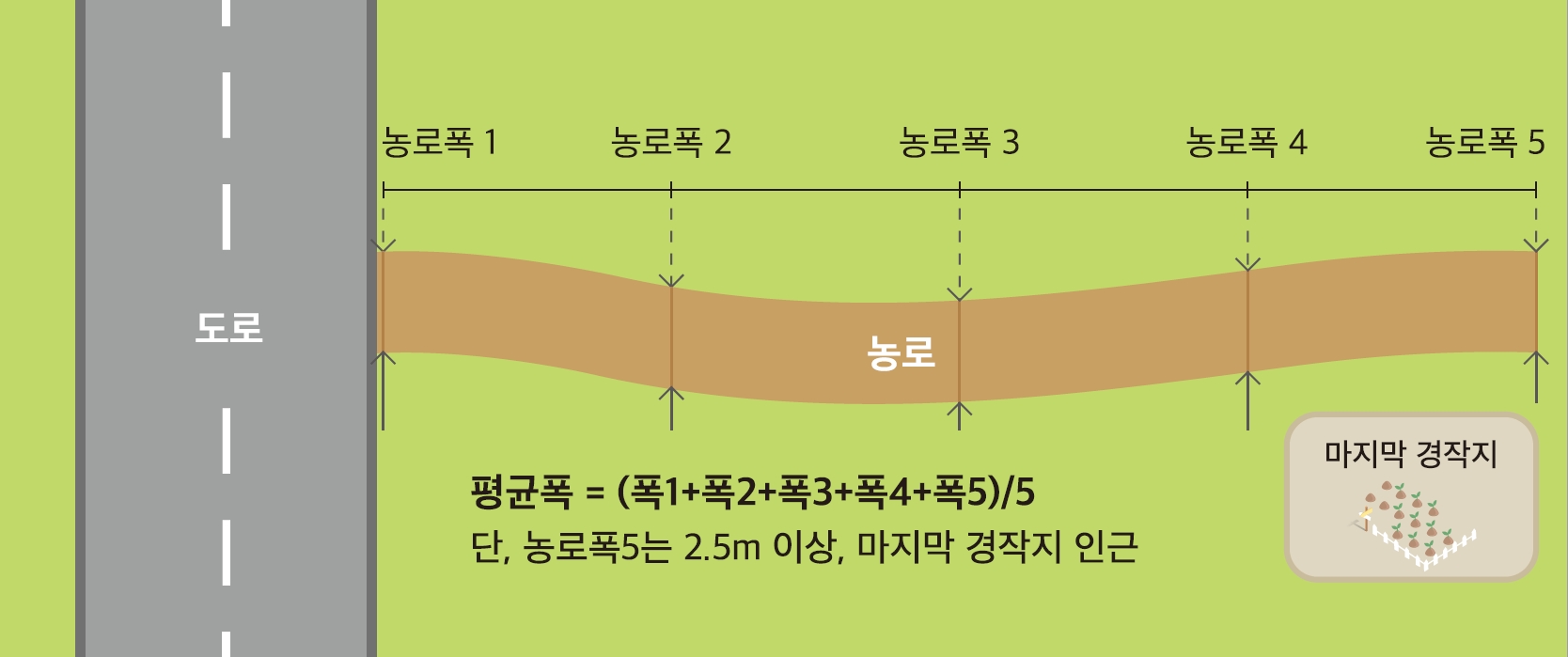 - 농로의 폭이 중간에 변경되는 경우 시점에서 종점까지의 평균 폭을 산정하고, 평균폭이 2.5m 이상일 경우 하나의 농로로 설정한다. 농로의 평균 폭은 시점에서 종점을 균등배분하여 5개 지점의 농로 폭을 측정한 이후 산술평균하여 결정한다.