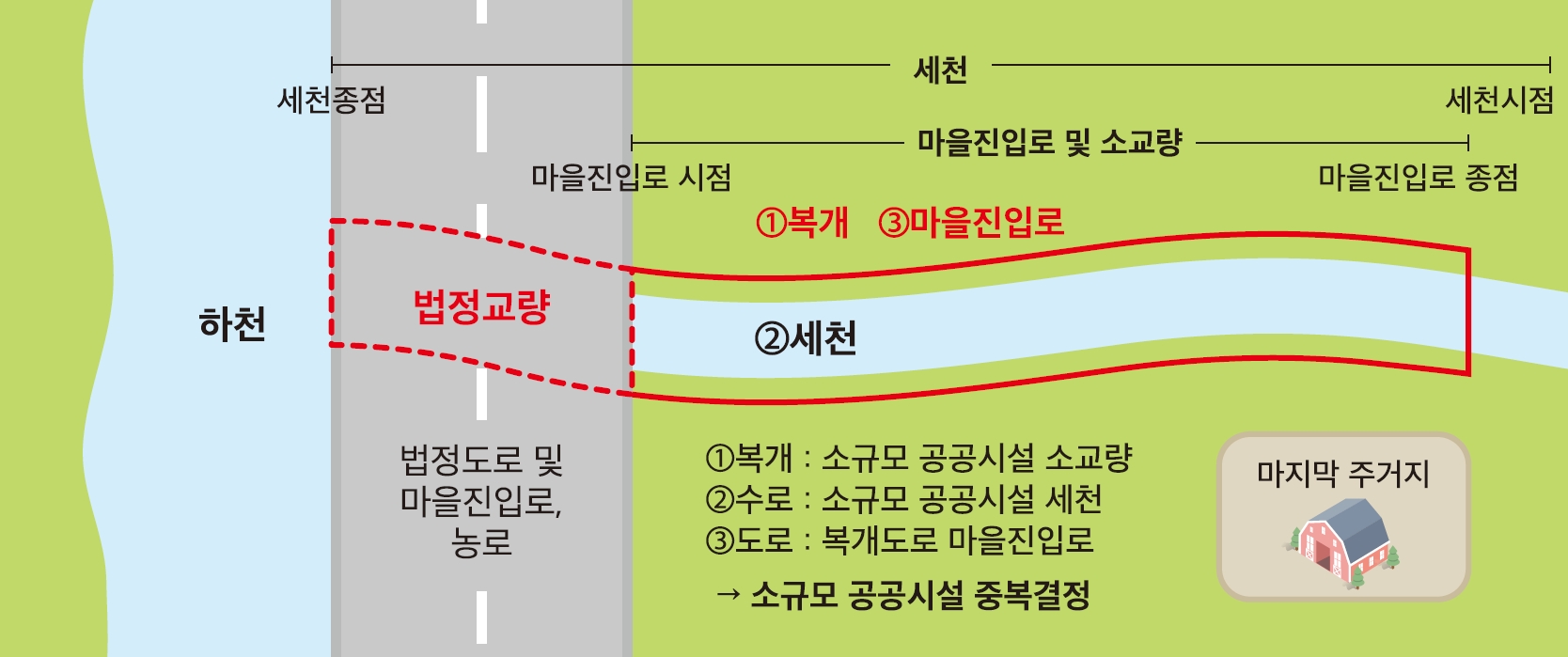 - 세천구간을 전체 및 부분복개하거나 하도를 따라 마을진입로로 사용되어 소규모 공공시설 소교량으로 설정된 구간이 위치하는 경우 소교량구간을 포함하여 상하류 구간을 동일한 마을진입로로 설정한다.