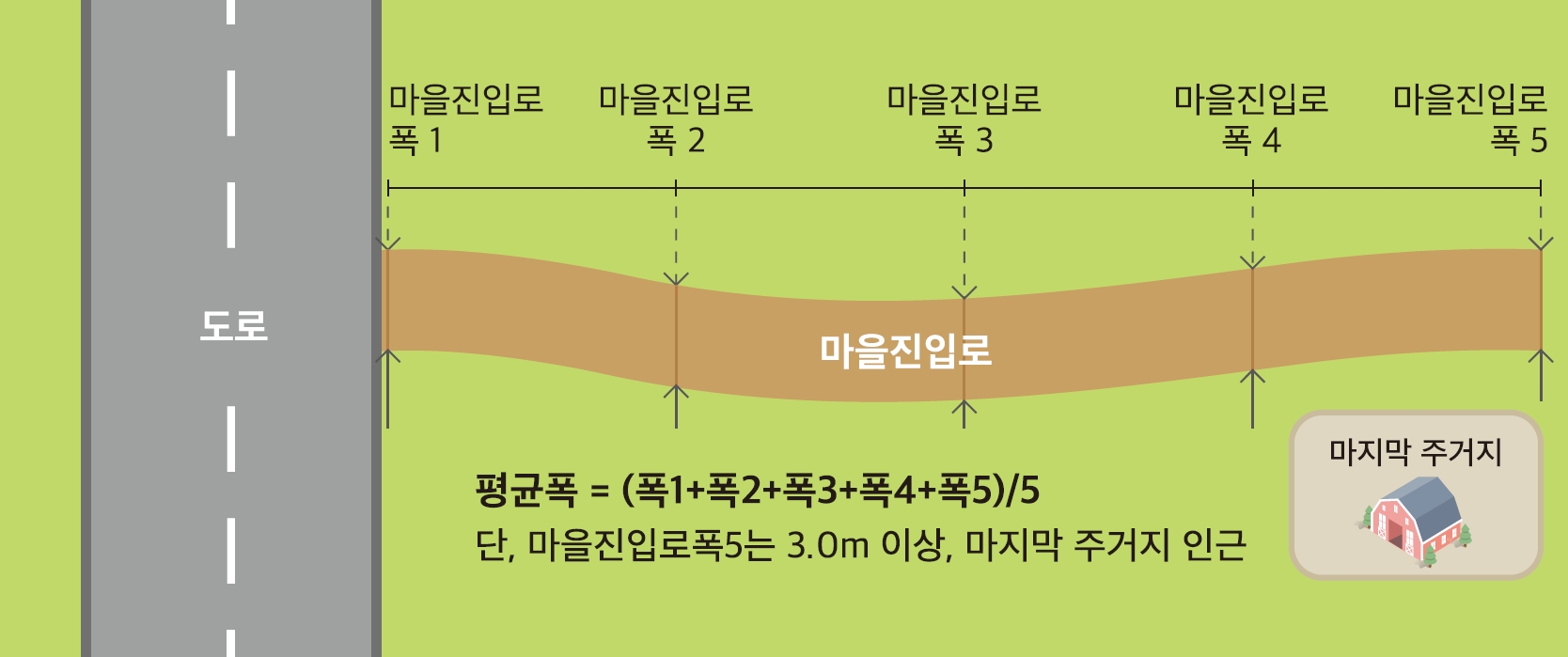 - 마을진입로의 폭이 중간에서 변경되는 경우 시점에서 종점까지의 평균 폭을 산정하고, 평균 폭이 3.0m 이상일 경우 하나의 마을진입로로 설정한다. 마을진입로의 평균 폭은 시점에서 종점을 균등 배분하여 5개 지점의 마을진입로 폭을 측정한 이후 산술평균하여 결정한다.